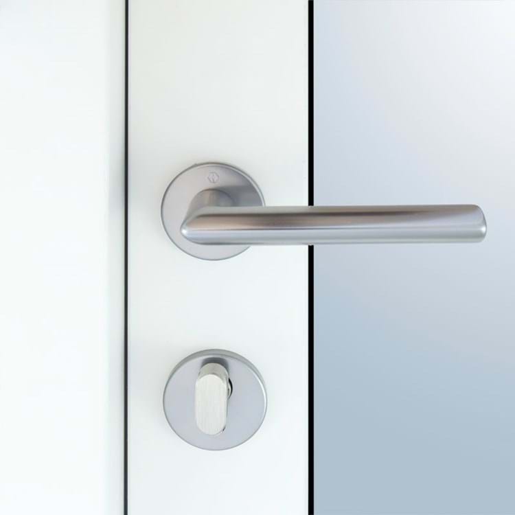 Stockholm facadedørsgreb i mat aluminium inkl. rosetter og 6-stiftet dråbeformet cylinder. Leveres med monteringsvejledning og skruer. (billede set indefra)