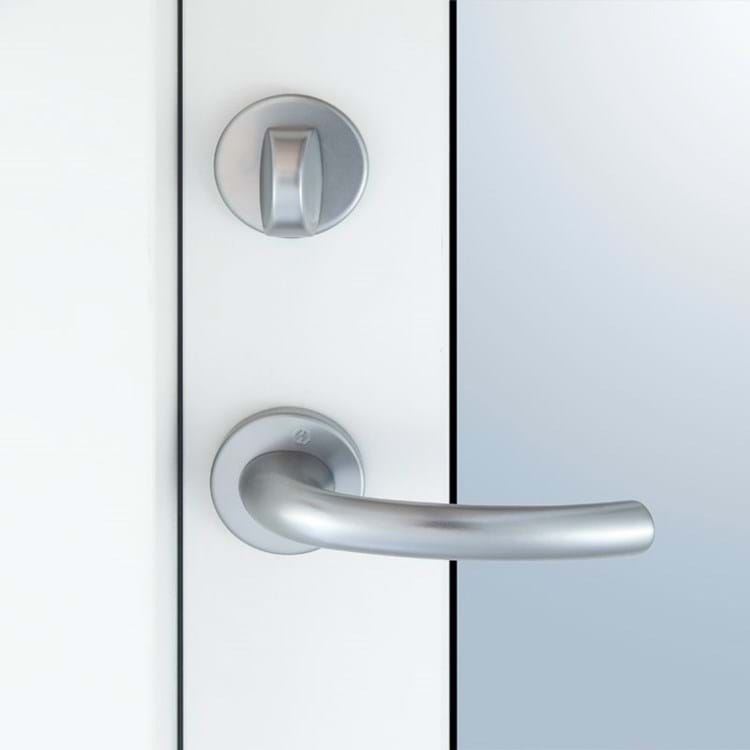Tokyo facadedørsgreb med rosetter i mat aluminium inkl. 6-stiftet oval cylinder. Leveres med monteringsvejledning og skruer. (billede set indefra)